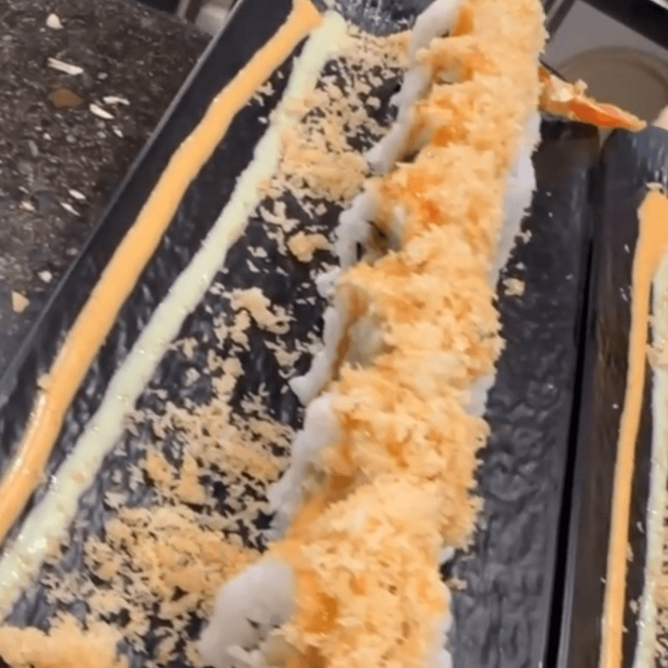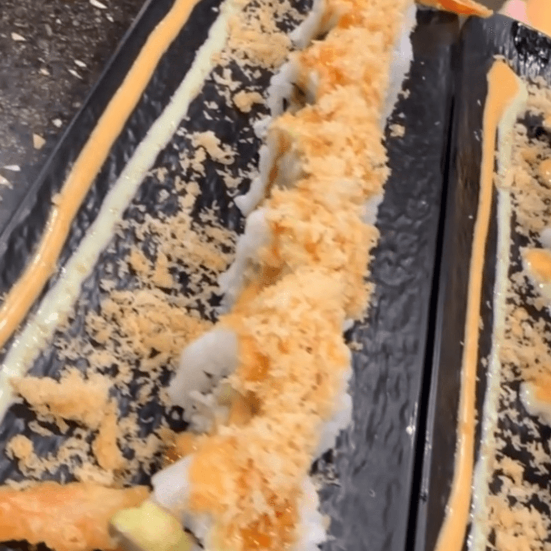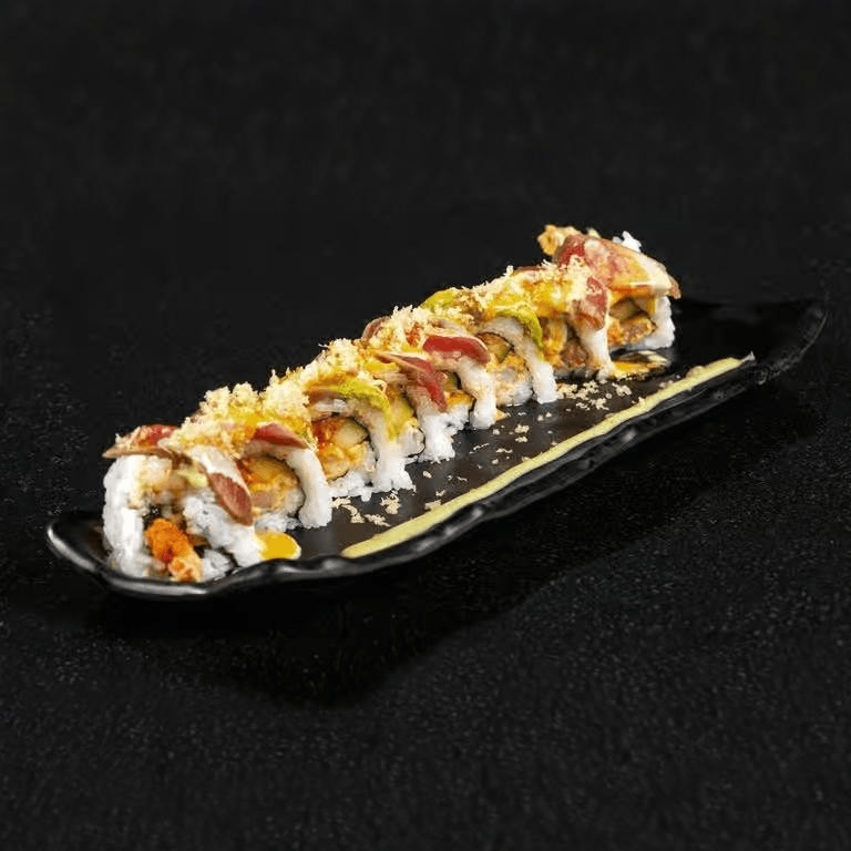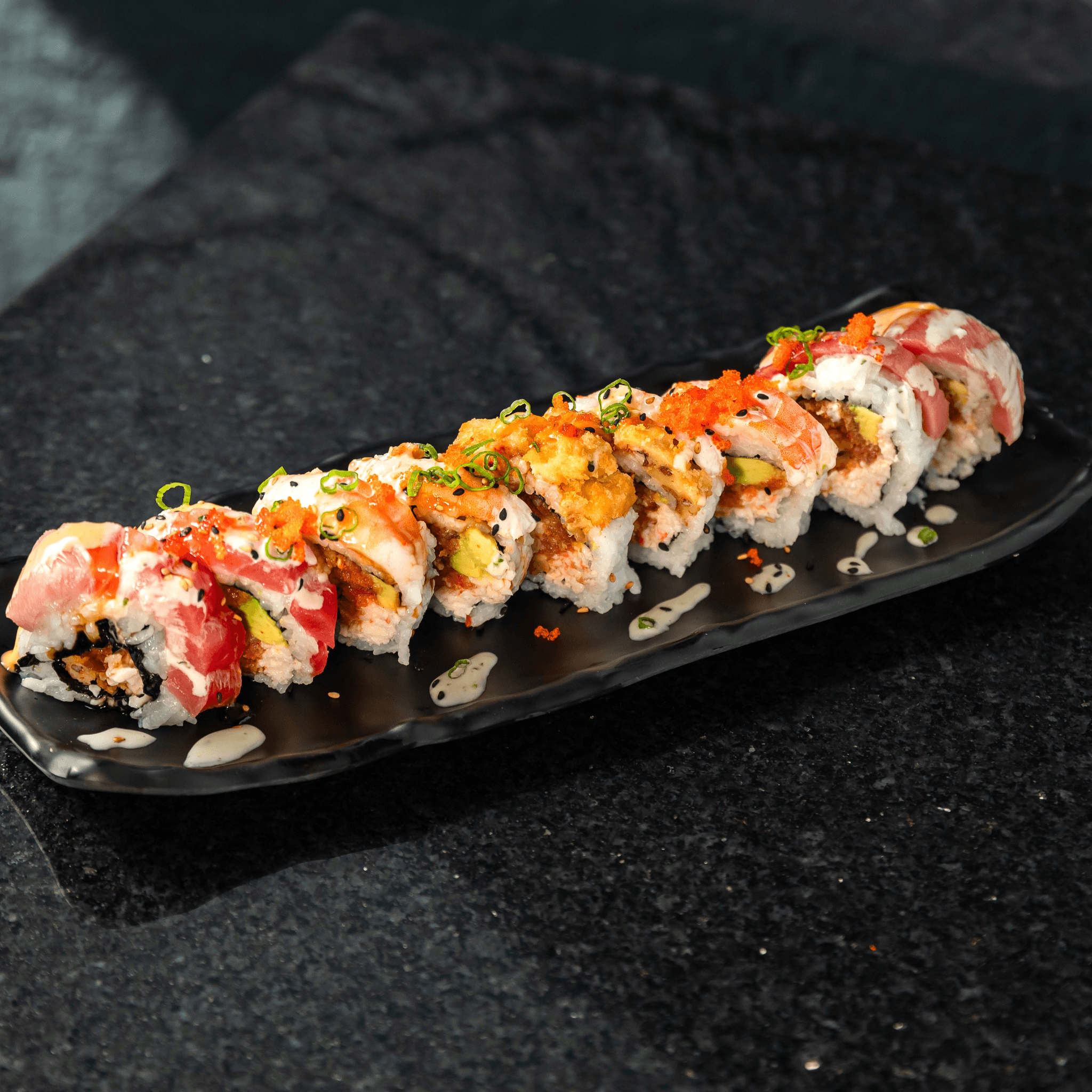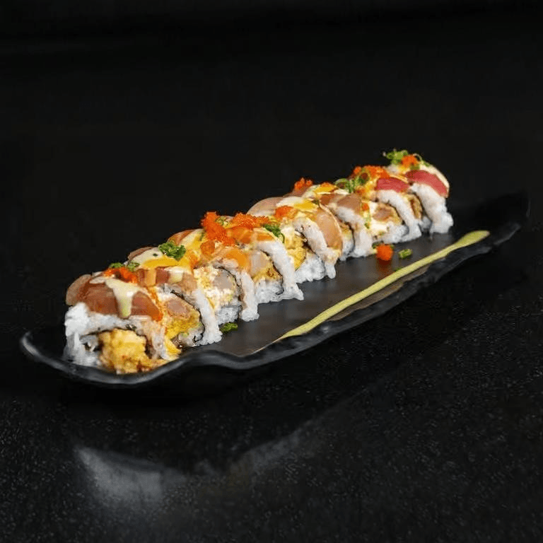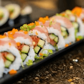 Spicy tuna, deep-fried shrimp, cucumber, cream cheese topped with avocado, seared tuna, crunch flakes