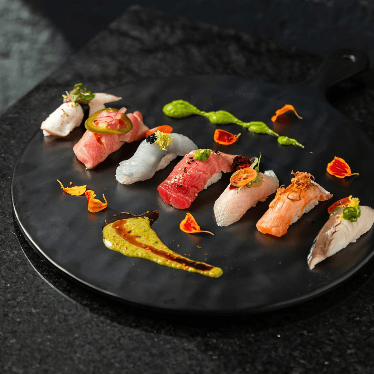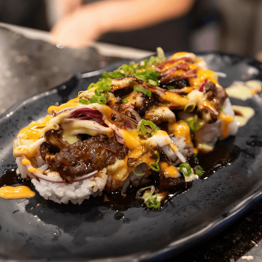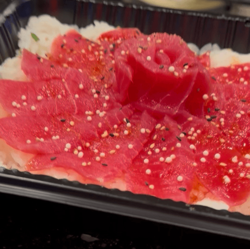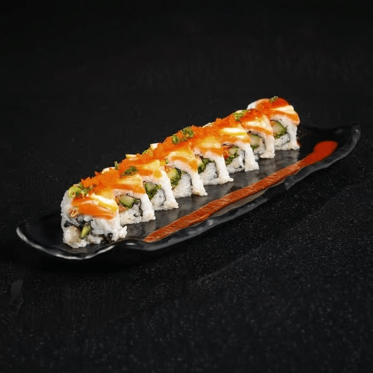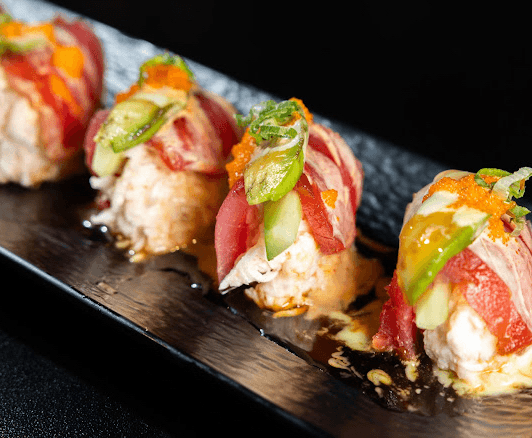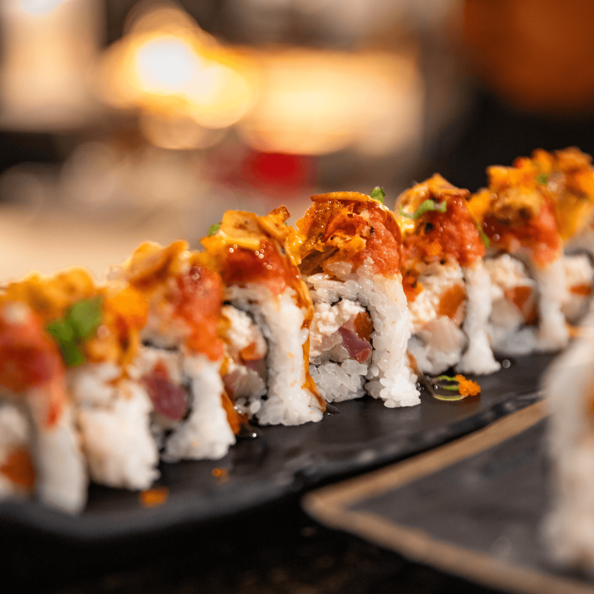 Spicy tuna, deep-fried shrimp, cucumber, cream cheese topped with avocado, seared tuna, crunch flakes