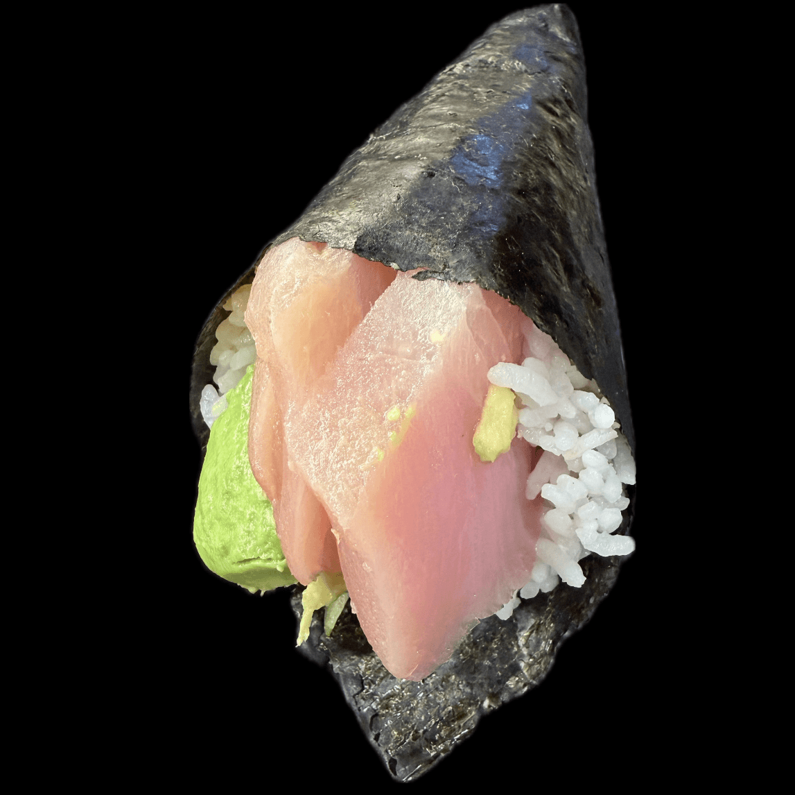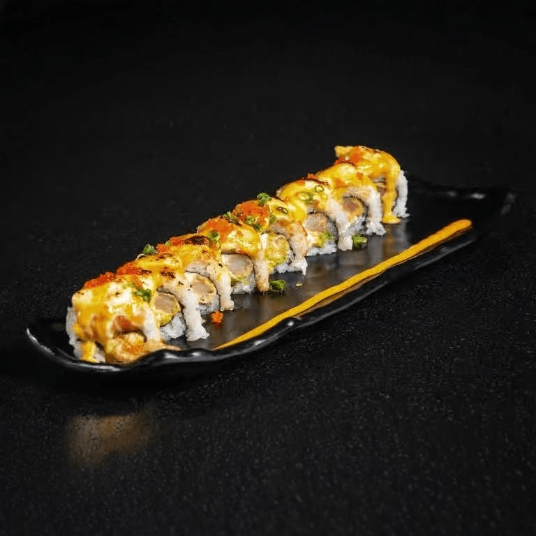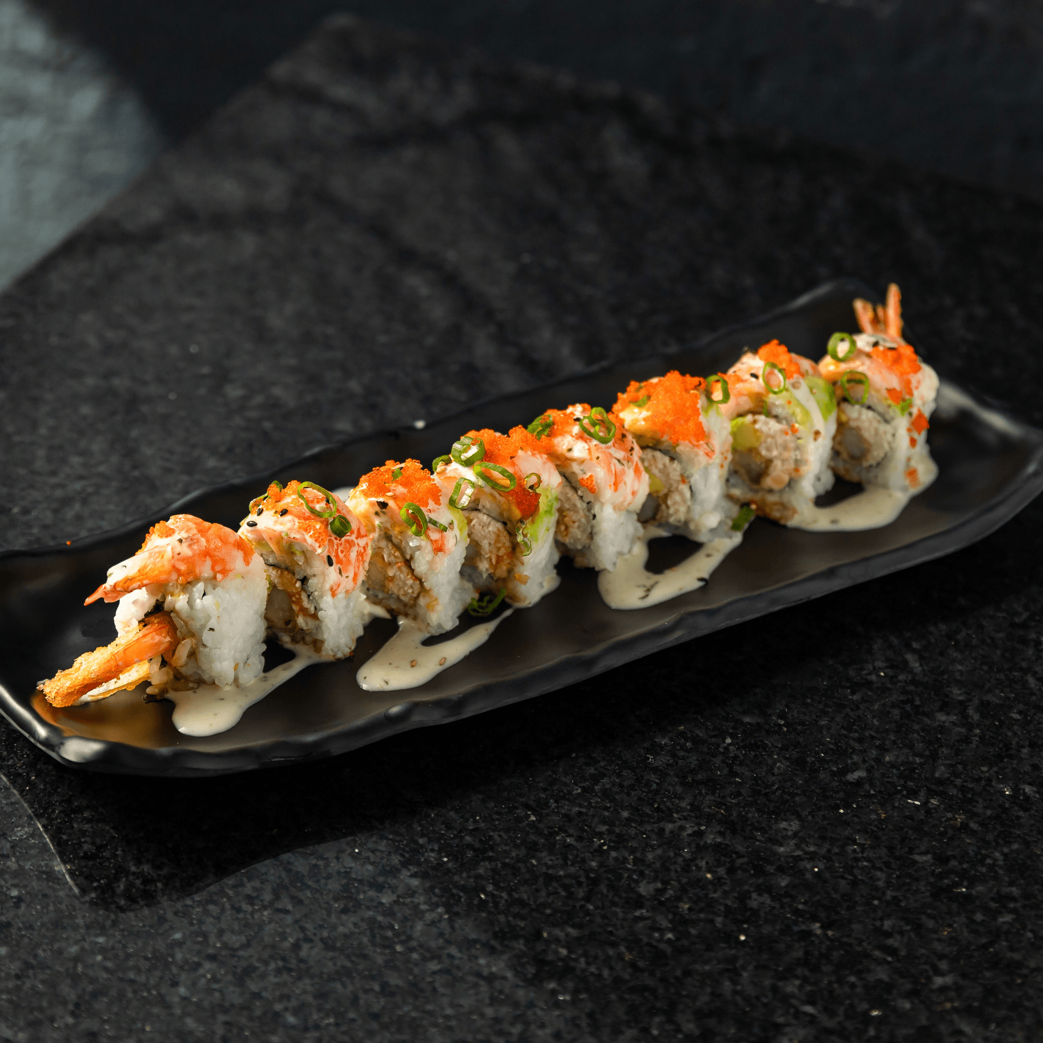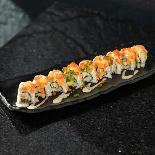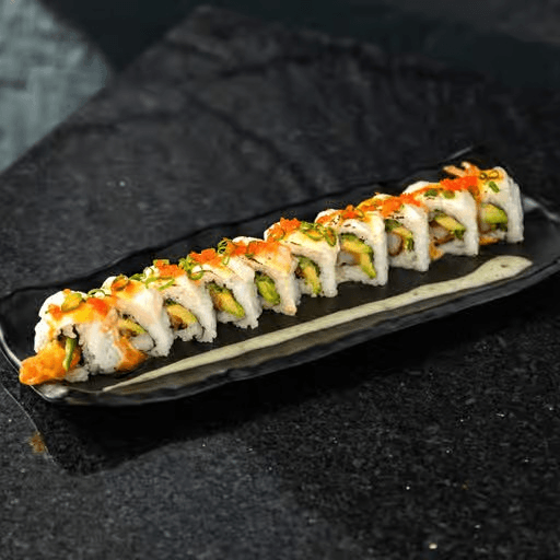 Cucumber, avocado, deep-fried shrimp topped with ono, torched.