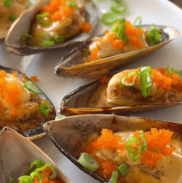 Cucumber, deep-fried shrimp, avocado topped with scallop torched