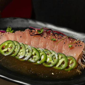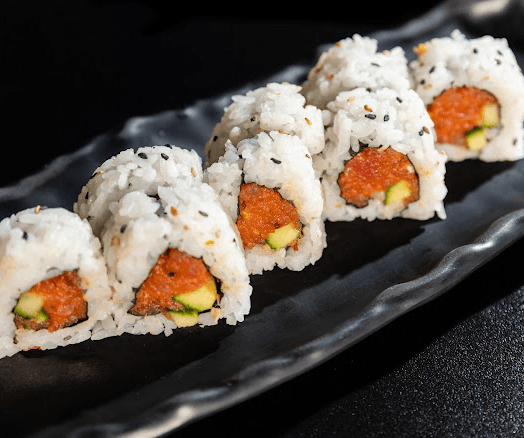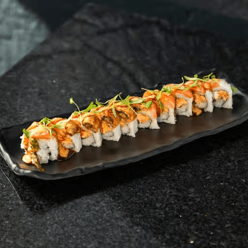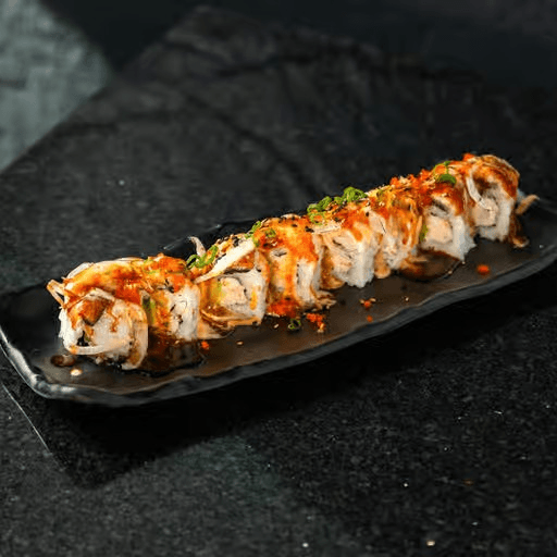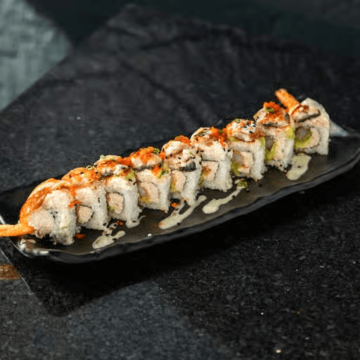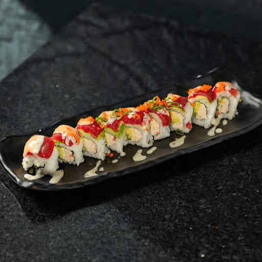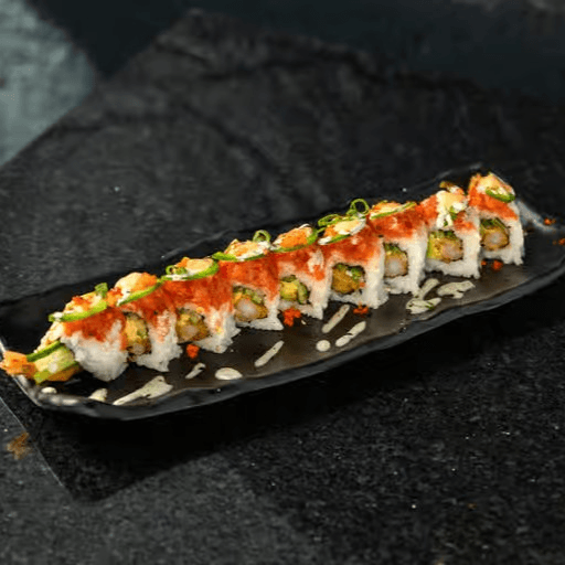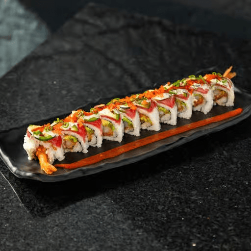 Spicy tuna, avocado, deep-fried shrimp topped with fresh tuna and jalapeño
