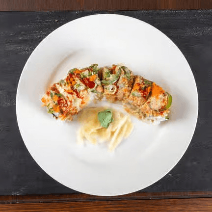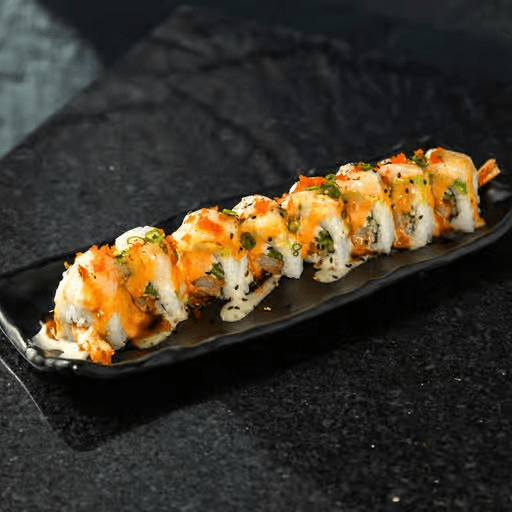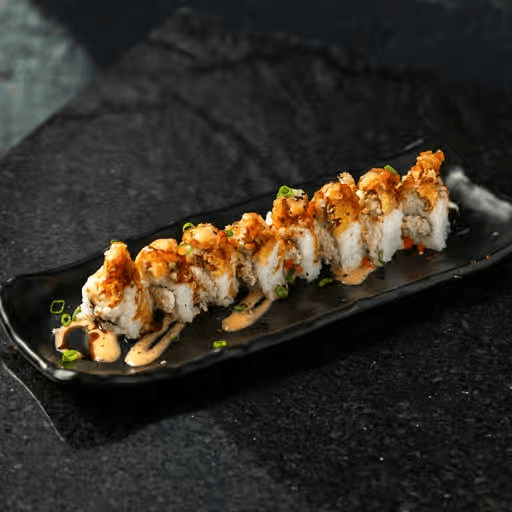 Crab, avocado, deep fried shrimp topped with spicy tuna, unagi, torched