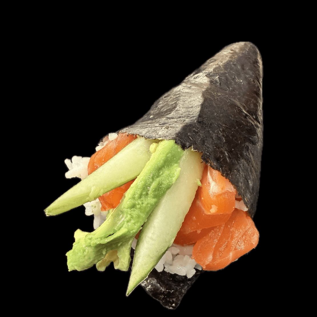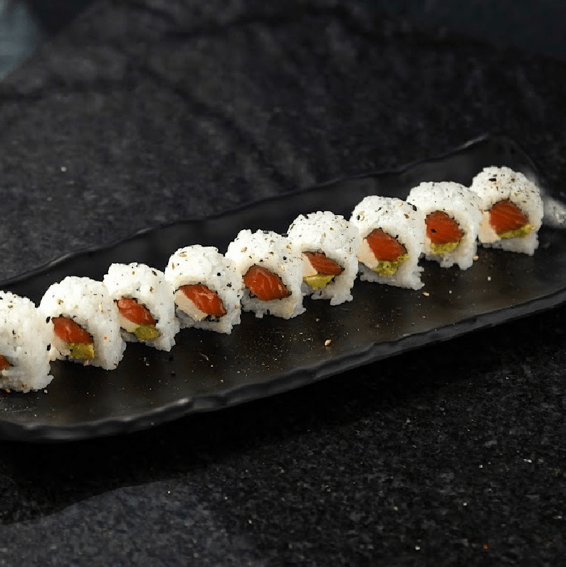 Crab, cucumber, deep-fried shrimp, avocado, salmon, lemon, crunch flakes