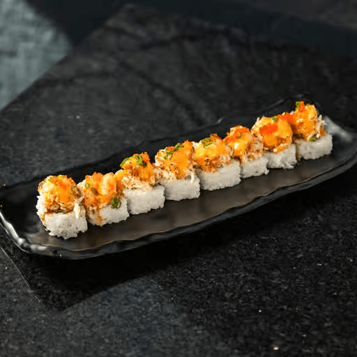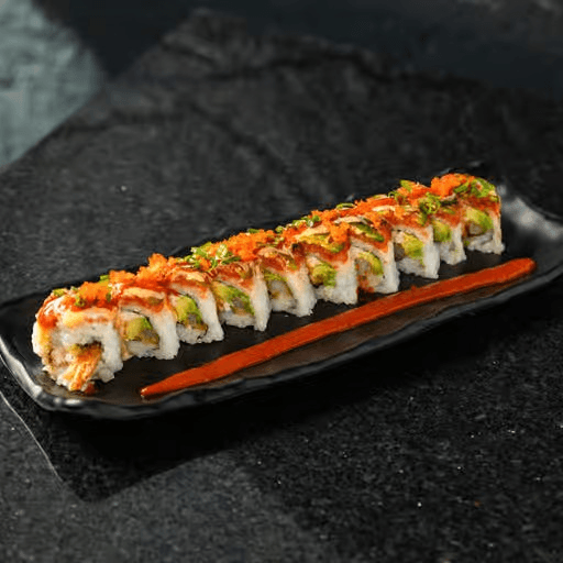 Crab, avocado, deep-fried shrimp topped with spicy tuna, jalapeño