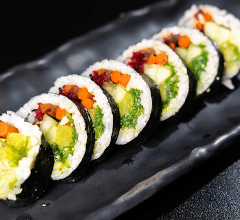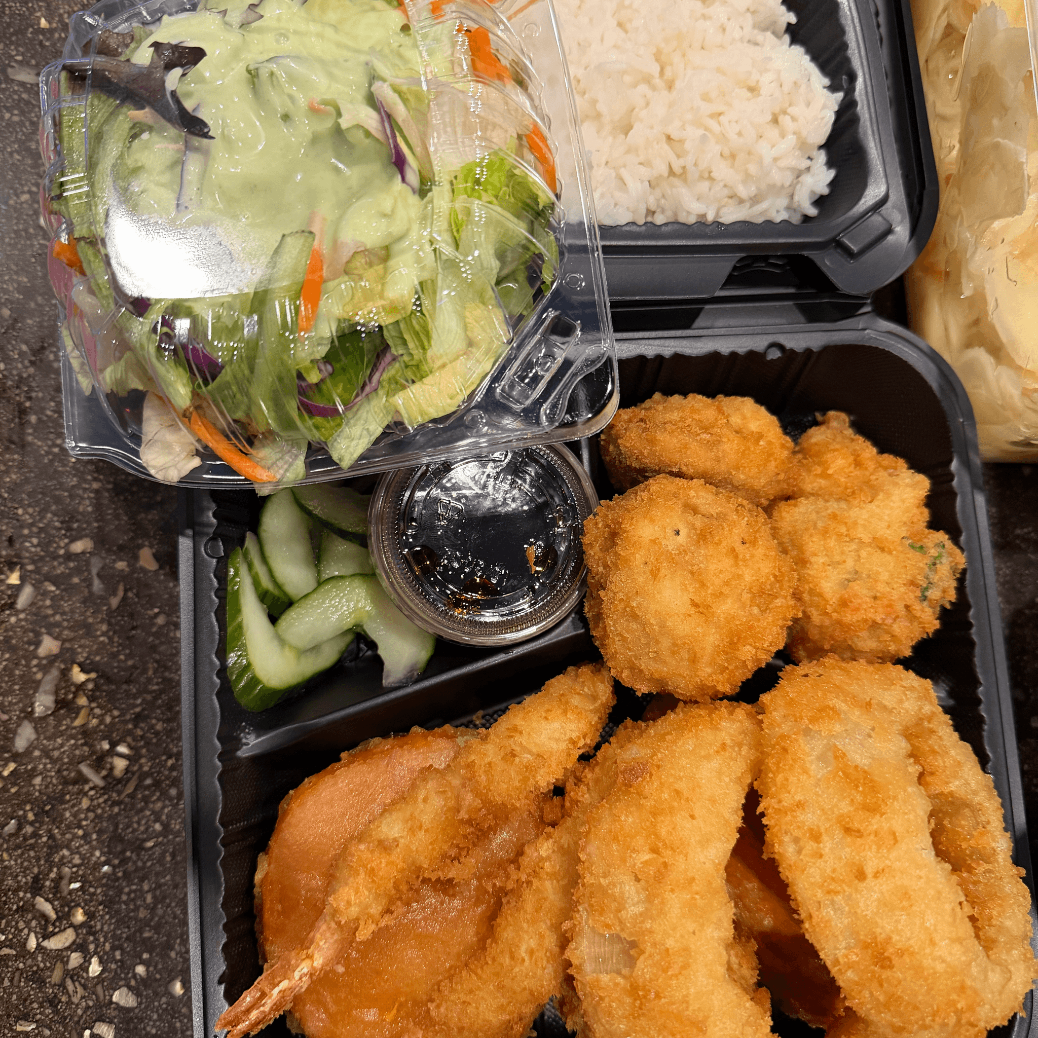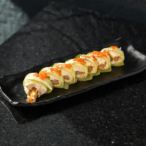 Crab, cream cheese, avocado, crab, deep-fried shrimp wrapped in cucumber