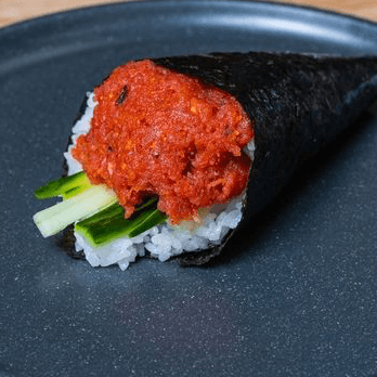 Deep-fried shrimp, cucumber, avocado topped with spicy tuna, jalapeño